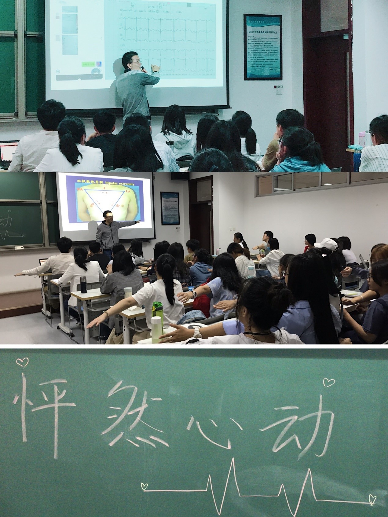 活动开始,贾鹏同学首先和大家分享了三个蕴含人生哲理的心理短视频,并与在座的同学们亲切互动,交流心得感悟,引导同学们树立正确的心态,积极面对人生。随后,贾鹏同学从心电图的布局、心电图与心脏的联系、心电图异常与疾病的联系和心理状态对心电图的影响等方面出发,通过生动形象的比喻和便于记忆的肢体动作将心理和心电知识娓娓道来,深深吸引了在座的同学们。在讲解心电图知识的同时,他和同学们分享,当人处于不良的心理波动时,要及时调节心理状态,避免情绪波动带来的不利影响,我们要学会掌控自己的情绪,用积极的心态去面对未来。活动中,同学们互动积极,气氛活跃融洽,同学们纷纷表示通过这次活动不仅引导大家树立积极的心态,也在朋辈的交流中,在轻松的氛围中增强了对心电图知识的兴趣和理解,收获满满。