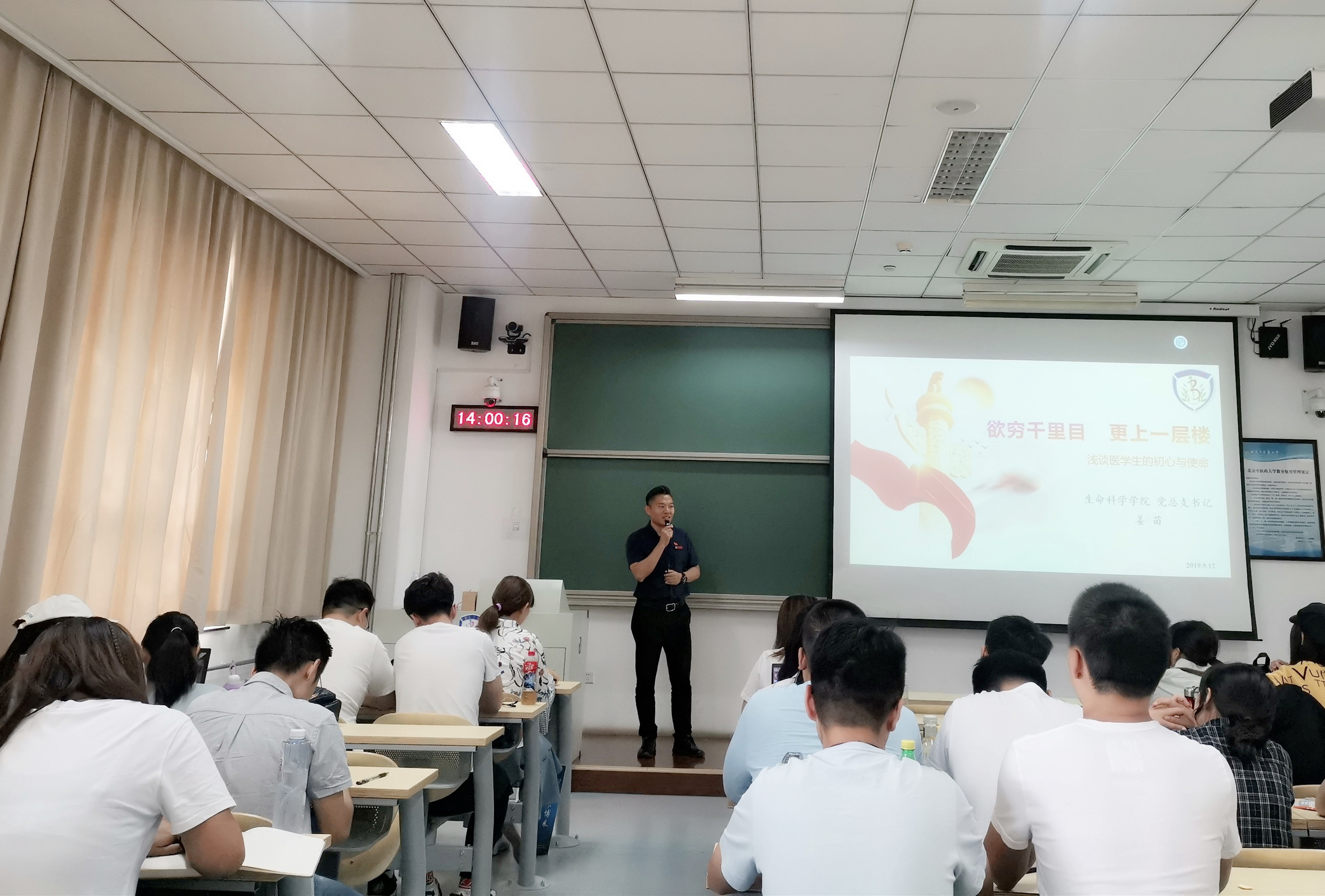 2019年9月12日,在良乡校区162教室,威廉体育williamhill新生入学教育系列活动之“新生第一次党课”顺利举办。威廉体育williamhill党总支书记姜苗以“《欲穷千里目,更上一层楼》——浅谈医员工的初心与使命”为题,结合自己的学习及工作经历,给新生们上了一堂生动的党课。