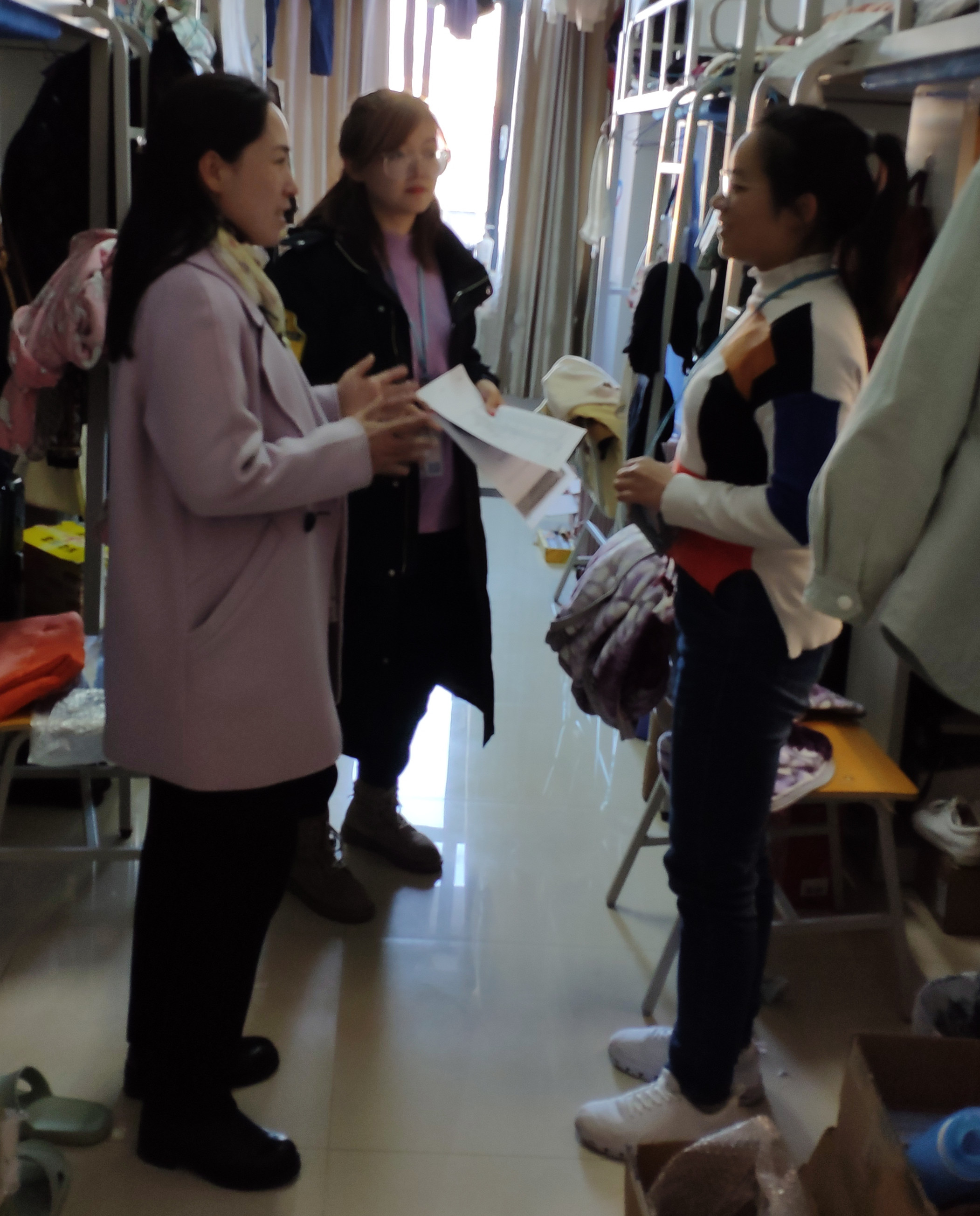在深入宿舍过程中,许珊老师和同学们进行交流,了解大家的学习科研生活情况,同时以鲜活的案例强化同学们的安全意识,强调了出门即时关闭电源、严禁使用违规电器、严禁使用床帷等安全注意事项的细节,号召同学们共同创造安全、整洁、有序、文明的学习和生活环境。王利老师、李楠老师及员工干部,对寝室安全及卫生做了仔细检查和详细记录,在检查的过程中对发现的问题进行及时提醒,督促整改。