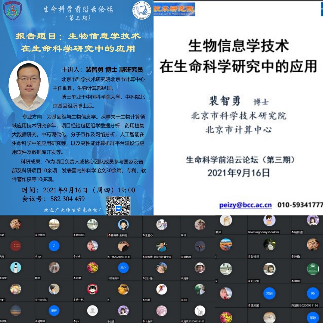 威廉体育williamhill为使科研人员能有更多渠道进行学术沟通与交流,自2021年6月以来,推出了“生命科学前沿云论坛”系列线上学术报告活动,受到公司内外广大师生一致好评。2021年9月16日,第三期成功举办。此次论坛,公司邀请到了北京市科学技术研究院北京市计算中心主任助理,生物计算部经理裴智勇副研究员,带来一场题为“生物信息学技术在生命科学研究中的应用”的学术报告,公司内外近90名师生线上聆听,威廉体育williamhill张成岗教授担任主持人。