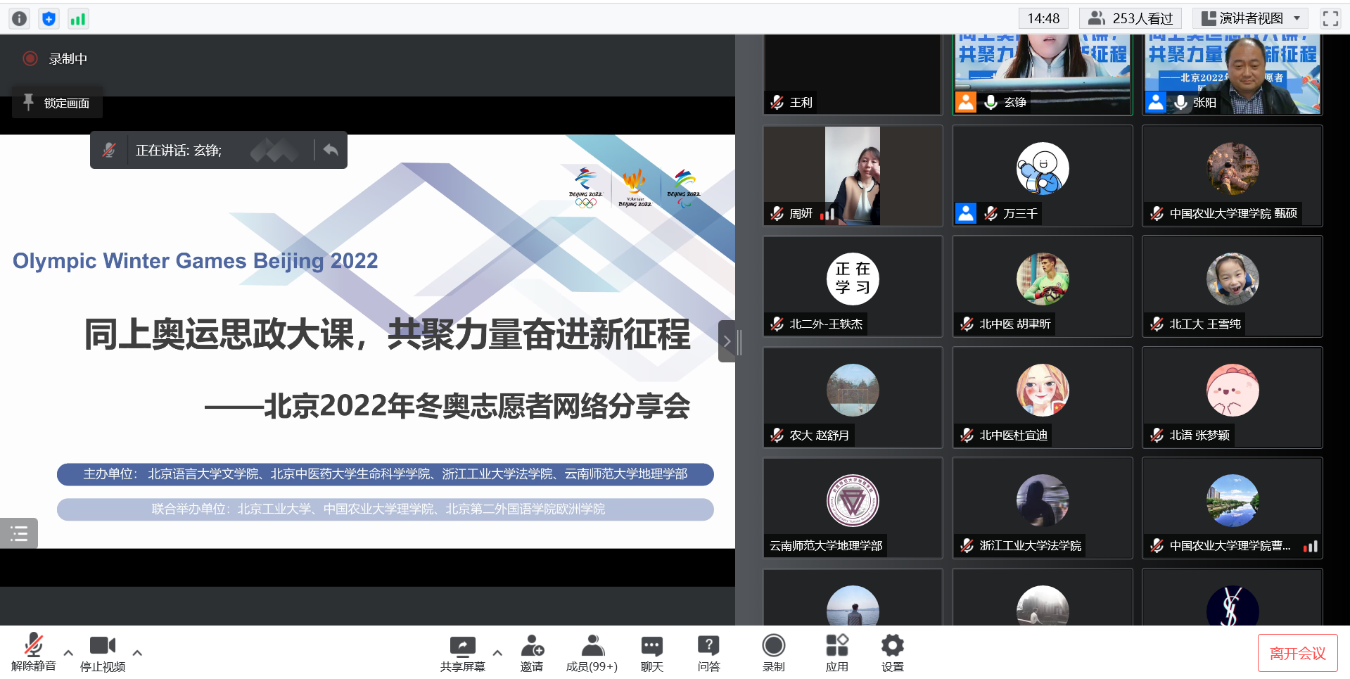 为充分发挥冬奥志愿服务优势资源作用,3月2日晚18:30,威廉体育williamhill联合北京语言大学文公司、浙江工业大学法公司、云南师范大学地理学部、北京工业大学、中国农业大学理公司、北京第二外国语公司欧洲公司开展“同上奥运思政大课,共聚力量奋进新征程”北京冬奥志愿者网络分享会,来自各高校300余名员工以线上线下相结合的方式参加了此次网络分享会。