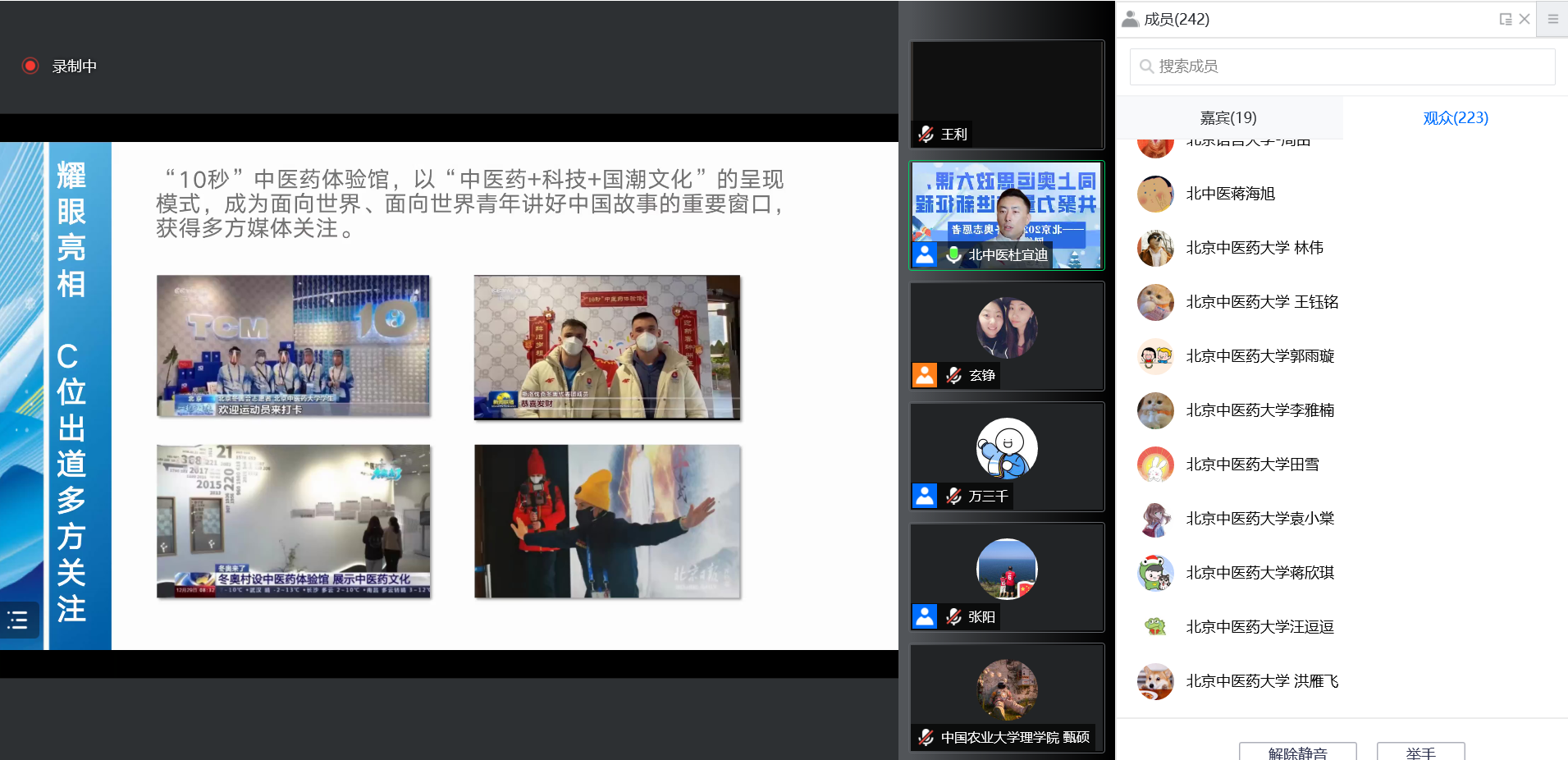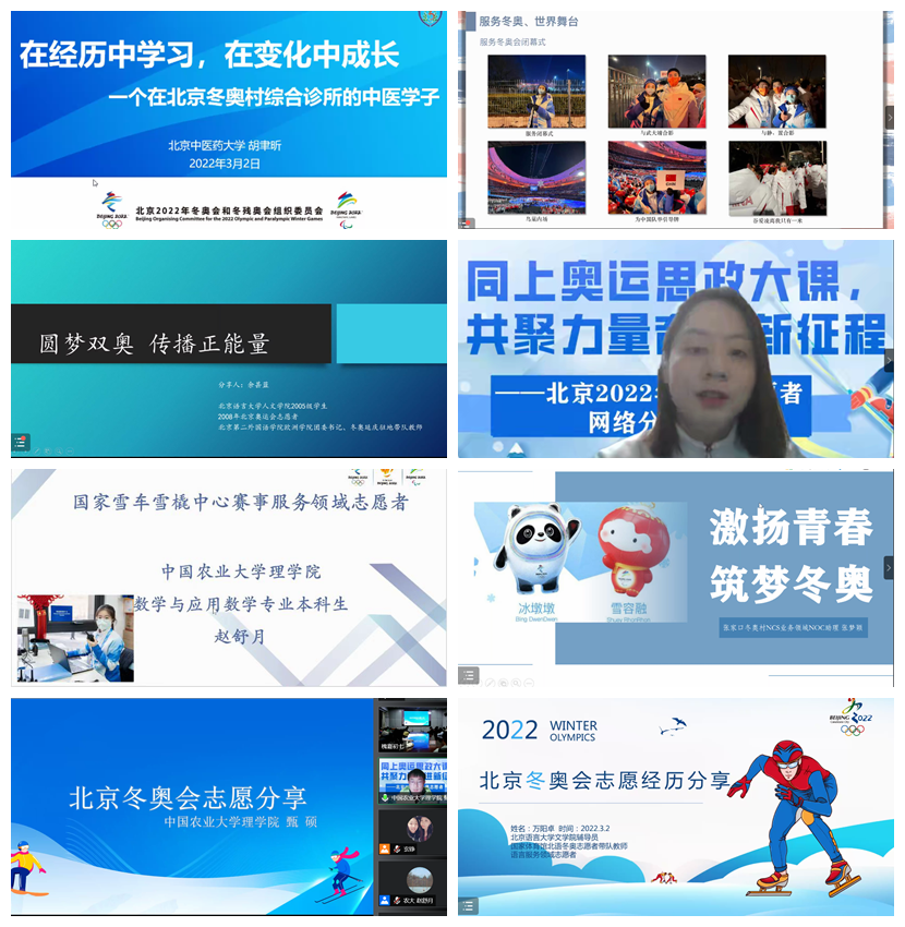 来自管理公司的杜宜迪同学向大家介绍了成为志愿者的初心与冬奥会志愿者服务期间的感动;中医公司的胡聿昕同学以“在经历中学习,在变化中成长”为题介绍了其在冬奥村为大家开展中医药服务的点滴与自己成长的心路历程。来自兄弟院校的10余名志愿者分别从不同视角介绍了自己服务冬奥的收获与感动。