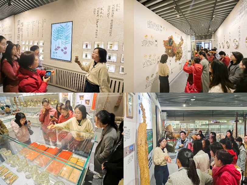 随后,博物馆中药部主任冯林敏老师带领大家参观三层的中药馆,其中矿物药、大型植物药材、九大仙草、中药炮制、外来中药等均为新开展区,老师们认真聆听介绍,共鉴馆藏,探秘中医药,通过闻香识药、中药饮片辨识等互动体验项目了解中药、认识中药、沉浸式体验中医药文化。